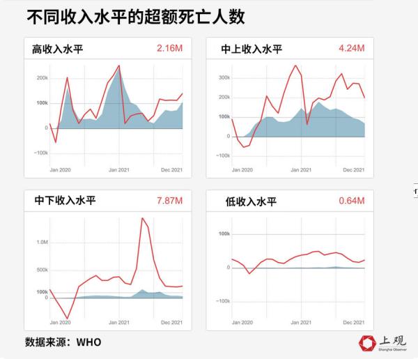 根据世界银行划分的收入水平来看,疫情这两年,中等收入国家超额死亡人数共有1211万人,占总数的81%(53%在中下收入国家,28%在中上收入国家),高收入和低收入国家分别有216万和64万超额死亡的人,分别占比15%和4%。