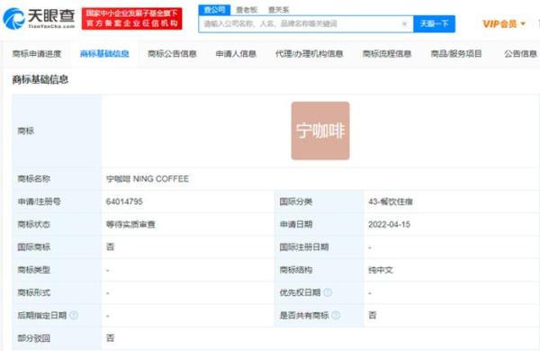 天眼查App显示,近日,李宁体育(上海)有限公司申请注册“宁咖啡NING COFFEE”商标,国际分类为餐饮住宿,当前商标状态为等待实质审查。