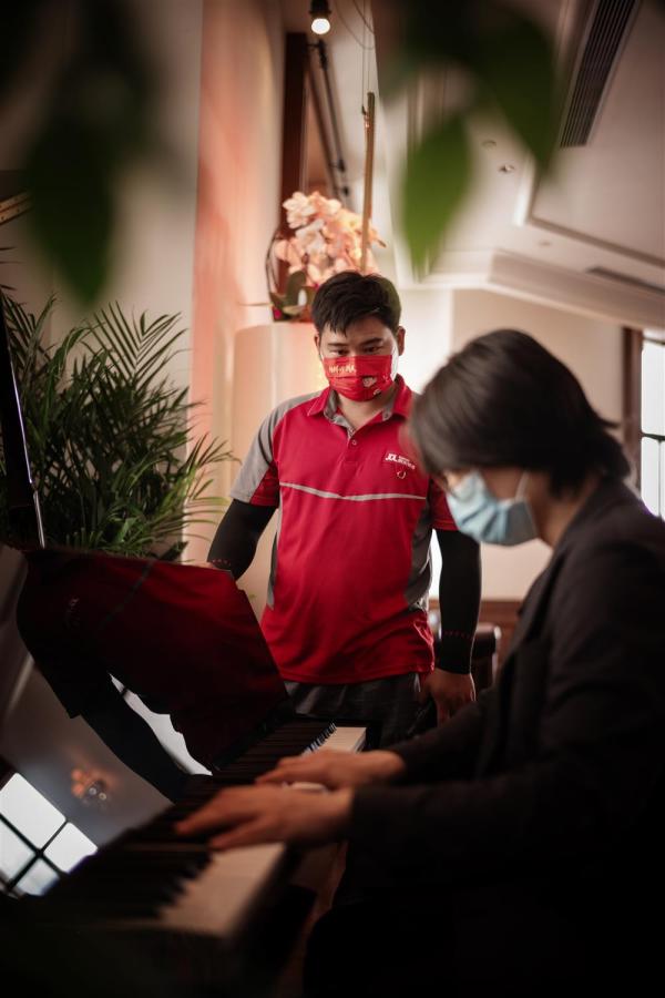 在外滩27号,宋思衡坐到一架电钢琴前,为贾龙飞演奏起一首自己创作、还未发表的作品《追忆》。这首曲子和《疫情音乐日记》风格一脉相承,简单、干净、克制,如同窗外静静流淌的黄浦江。贾龙飞在音乐声中望向窗外,对岸是阳光下的东方明珠。