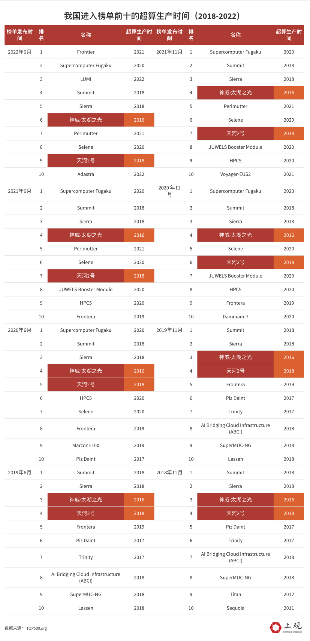 这并不仅仅体现在今年的榜单中,在之前TOP500发布的八次榜单中,我国上榜前十的神威·太湖之光和天河2号的生产时间分别是2016年和2018年。