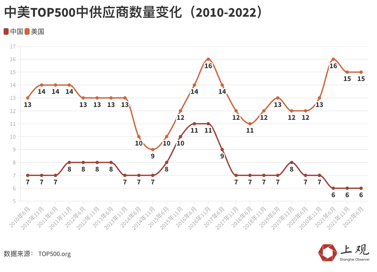 相反,美国超算却有越来越多的供应商,近两年的供应商甚至比中国的两倍还多。