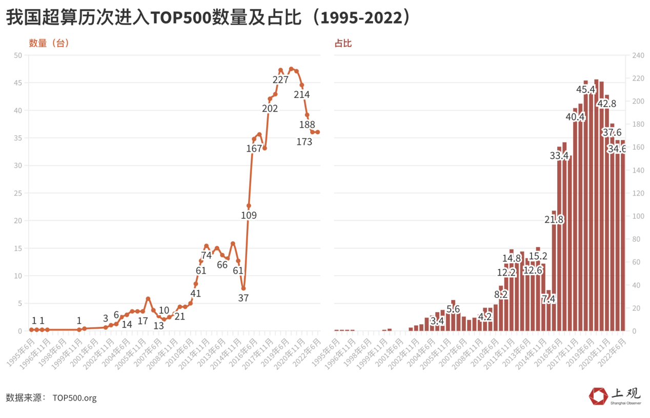 与欧美日等国家相比,我国在超算方面起步较晚。1995年6月,我国超算才首次出现在TOP500的排行榜单中。之后的17年里,我国进入TOP500排行榜单的超算数量不断攀升,最多有228台,占榜单的45.6%。