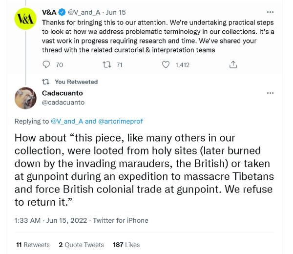 在被网友揭穿了这点后,英国维多利亚与阿尔伯特博物馆的官方账号在评论区发布了留言,表示自己“关注到了这一问题”,并称正研究如何解决对自己藏品的标注和介绍。但不少网民并不买账,有人就表示应该明确说明这个文物是被抢夺来的,而且英国还拒绝将其归还中国。