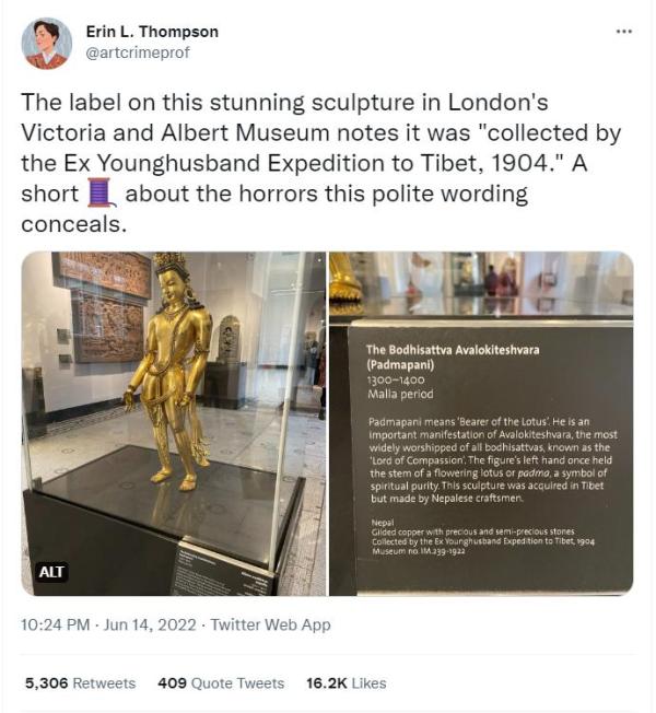 近日,一位研究文物历史及犯罪情况的外国博主在推特上发布的一张照片显示,英国知名的维多利亚与阿尔伯特博物馆将一个被英国侵略者从西藏掠夺而来的文物,标注成了“在考察时收集而来”。此事随即引起了广大网民的关注和批评,该博物馆也对此作出了回应。