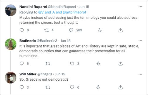 当有一条评论试图拿“文物应该放在安全的民主国家”来洗地时,另一位网友则拿英国拒绝归还希腊文物反问:“难道希腊不是民主国家吗?”