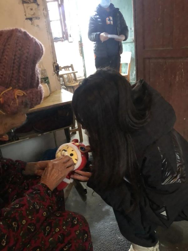 2021年12月,新春慰问行志愿者前往华容看望雷金二老人,雷奶奶开心地抚摸着志愿者带给奶奶小老虎玩偶。 图源 | 新春慰问行团队