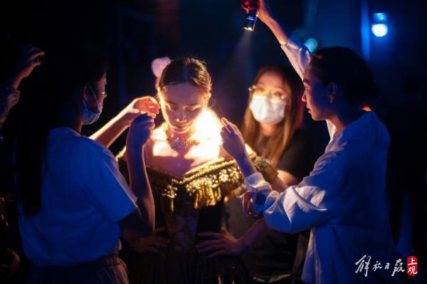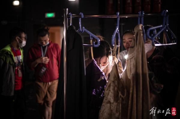 在演员们热身准备登台的同时,造型师们正在后台最后一次核验戏服。这场表演抢妆换衣服的节奏很快,决不能忙中出错。