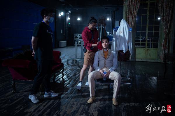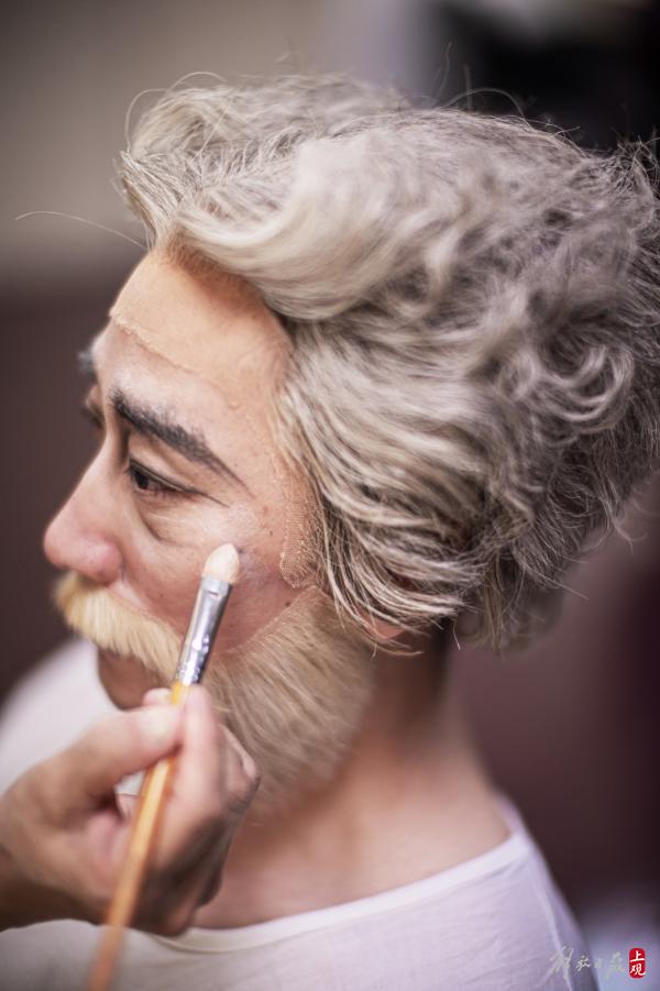 下午6点,完成彩排的演员们开始上妆。化妆师的妙笔把年轻的演员画成一位老者。