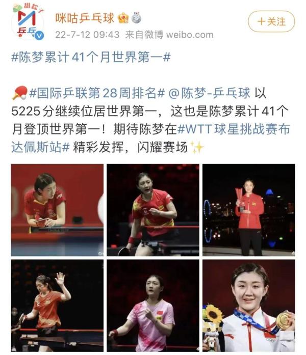 北京时间7月14日下午,乒乓球运动员陈梦的一条微博,冲上热搜第一。