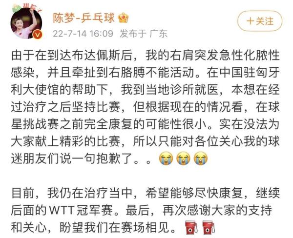 陈梦本人表示:“到达布达佩斯的前两天我一直在训练,但是因为右肩的急性化脓性感染,牵扯到右胳膊不能活动。本想在经过治疗之后坚持比赛,但根据现在的情况看,在球星挑战赛之前完全康复的可能性很小。现在我仍在治疗当中,希望能够尽快康复,继续后面的WTT冠军赛。”