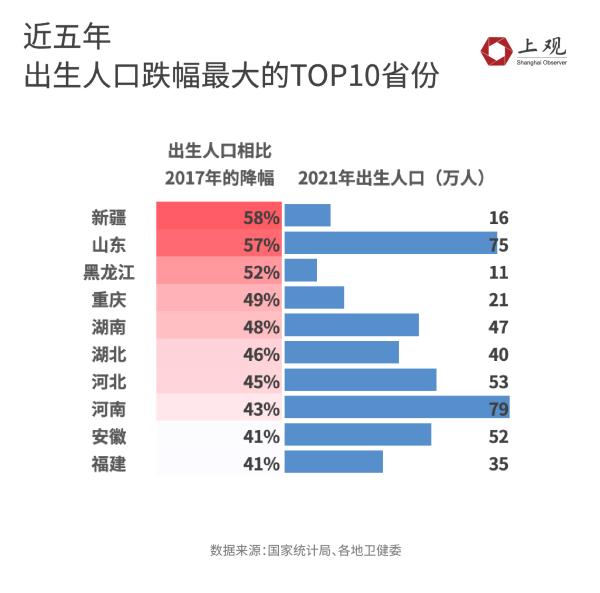 另外两个人口大省河南、河北的出生人口跌幅也分别达到43%和45%。
