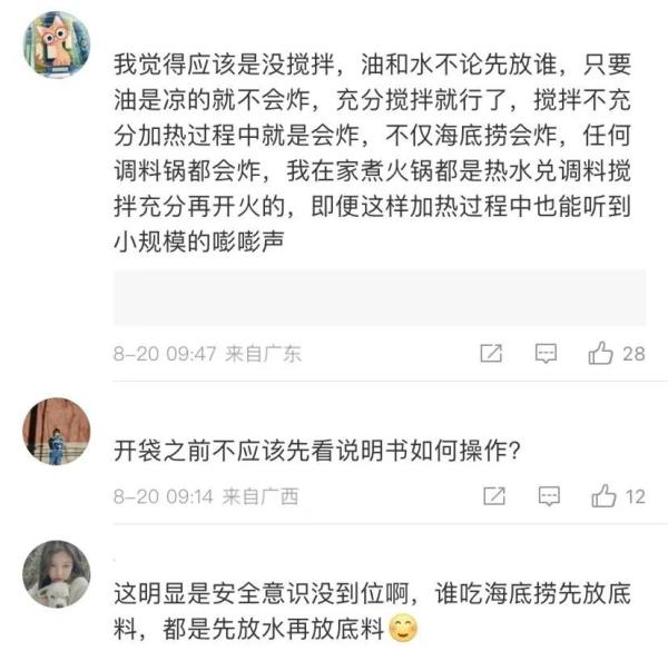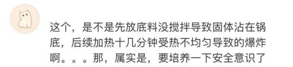还有网友表示,这个,是不是先放底料没搅拌导致固体沾在锅底,后续加热十几分钟受热不均匀导致的爆炸啊……那,属实是,要培养一下安全意识了。