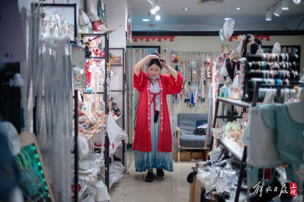 “周末有空我就来这里的汉服店看看新品。以前遇到心仪的款式,只能找人定制,价格贵,周期长。这两年国内做汉服的商家多了,买起来也方便很多。在迪美穿什么都有,有同好的氛围,能好好享受穿衣的自由。”
