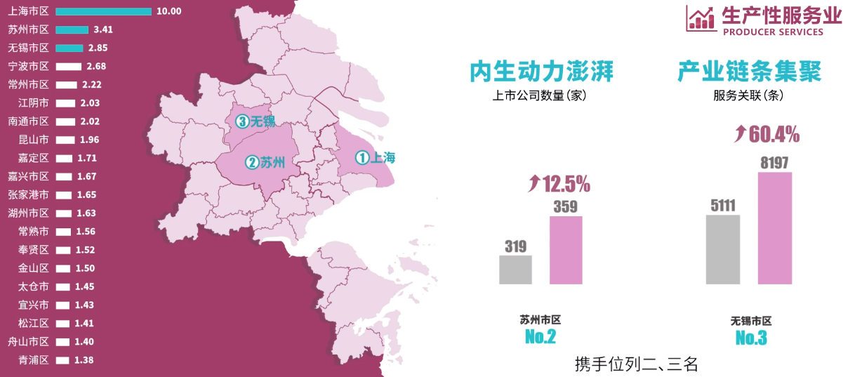 在该维度,上海市区继续满分“霸榜”,紧随其后的特色鲜明,颇有亮点。排名第二的苏州内生动力澎湃,上市公司数量在两年内迅速增加12.5%;排名第三的无锡,产业链集聚度显著增强,两年内的企业服务关联数量猛增60.4%。