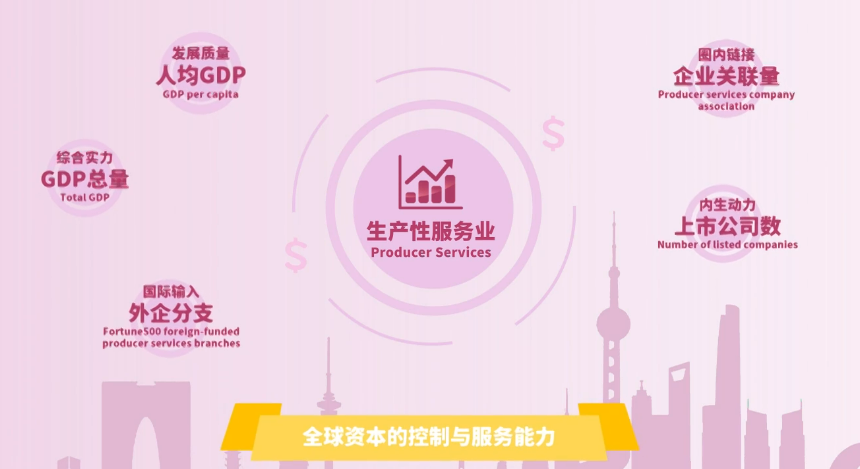 最关键的维度生产性服务业,反映一座城市对全球资本的控制与服务能力,细分指标包括GDP总量、人均GDP、外资生产性服务业分支数、企业关联个数、上市公司数量。