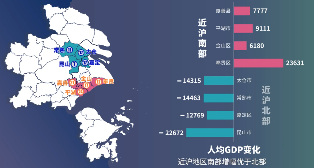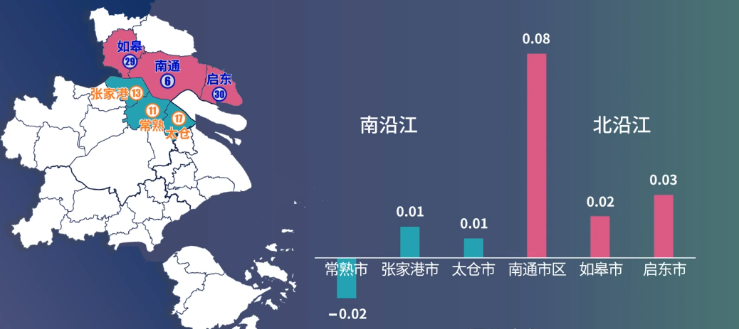如果跳出城市看区域可以发现,在上海大都市圈中,沪宁走廊的城市群越来越集聚,其中包括常州市区、无锡市区、苏州市区、昆山、嘉定和上海市区。从发展速度来看,经济实力相对薄弱的长江以北城市(如皋、南通市区、启东)异军突起,增幅要优于长江以南的张家港、常熟和太仓。