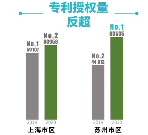 “坐二望一”的是苏州市区,除航运贸易维度以外,其他维度均为上海大都市圈第二,被视作“挑战者”。值得关注的是,苏州有部分指标甚至超越上海,比如科技创新维度的专利授权指标。2020年数据显示,苏州市区专利数量为83535件,超出上海市区约3000件。