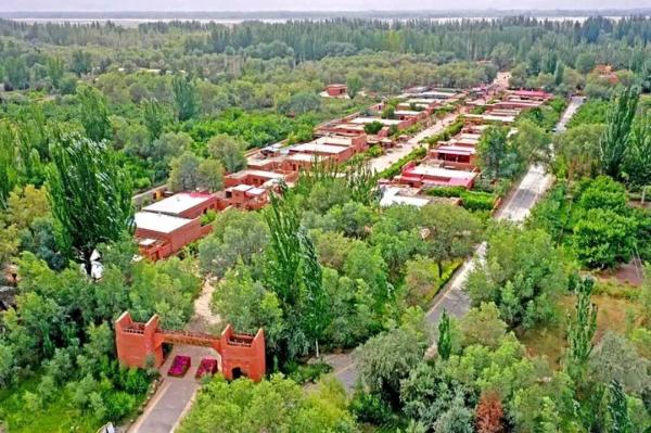 泽普县金湖杨国家森林公园拍摄的长寿民俗文化村全貌。