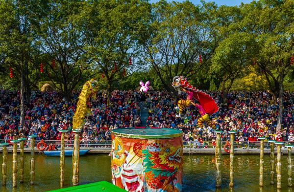 ↑2023年1月24日,春节期间,众多游客观赏南海西樵山天湖水上高桩醒狮表演(无人机照片)。