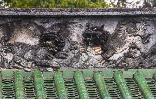 ↑黄氏宗祠屋脊上的灰塑表现的正是两头舞动的狮子,这里现在也是黄飞鸿狮艺武术馆,狮团固定在此为游客表演醒狮(2023年1月15日摄)。