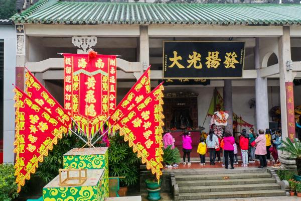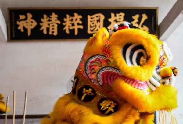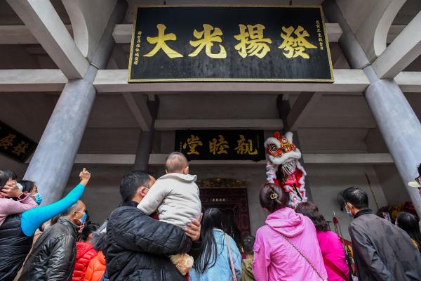 ↑在南海西樵镇的黄氏宗祠,同时也是黄飞鸿狮艺武术馆,狮团长期在此为游客表演醒狮(2023年1月12日摄)。发扬光大的牌匾被高高悬挂在表演区上方。