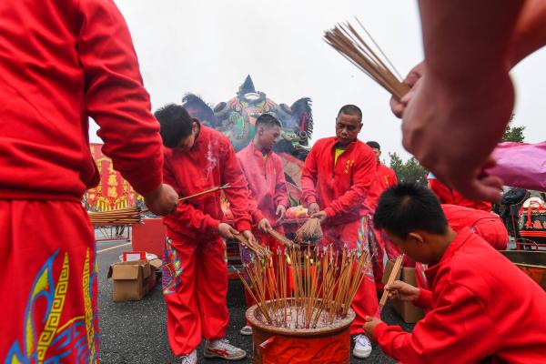 ↑黄飞鸿狮艺武术馆师徒在西樵山牌坊燃点香火。