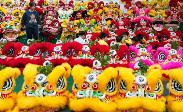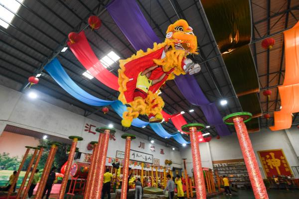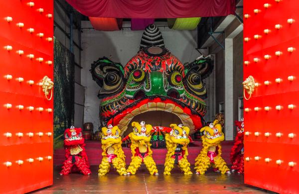 ↑2023年1月13日,在南海大沥黄飞鸿中联龙狮训练基地内,狮团在号称“世界狮王”的巨型狮头前舞狮。