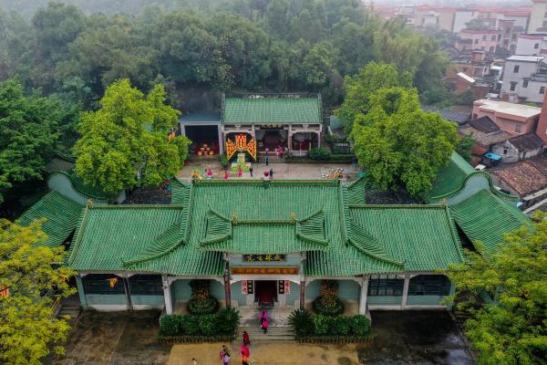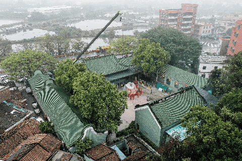 ↑西樵镇黄氏宗祠现在也是黄飞鸿狮艺武术馆。狮团在这里为游客表演醒狮技艺(无人机照片,2023年1月12日摄)。
