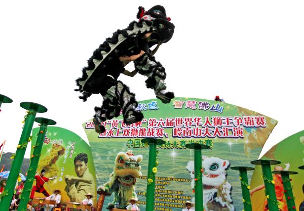 ↑2010年10月1日,在广东省佛山市南海区西樵山天湖公园举行的2010“黄飞鸿杯”第六届世界华人狮王争霸赛中,参赛选手在高桩狮比赛中表演“腾空飞跃”。新华社发(訚洪 摄)