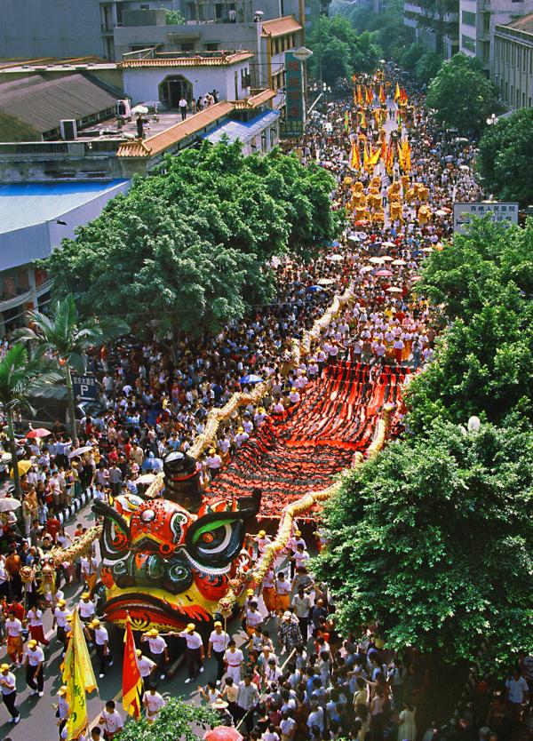 ↑2005年5月3日,南海西樵在“黄飞鸿杯”中国南北狮王争霸赛顺利闭幕后,在官山城区举行了“百狮巡游”活动,吸引了10万多名群众前来观赏。新华社发