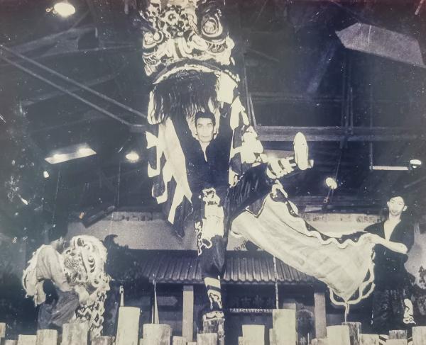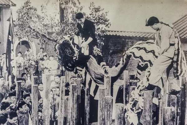 ↑20世纪40至60年代期间,香港拍摄的黄飞鸿系列电影当中的醒狮元素(剧照翻拍,2023年1月12日摄)。