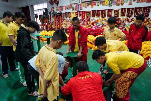 ↑2023年1月13日,在南海大沥黄飞鸿中联龙狮训练基地,一群来自广州市从化区练习醒狮的青少年跟随教练搭建高桩。