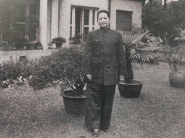 宋庆龄身着中山装在上海家中庭院内留影。“我刚刚到家,发现气候清爽,我很喜欢……我的小花园很怡人,有高大桉树,鸟儿在上面筑巢,清晨鸟儿们歌唱。我的管家说它们似乎知道我回家了,一直在歌唱!”1972年11月13日,宋庆龄致函友人邓广殷,在信中谈及回到上海家中后的喜悦之情。