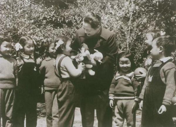 1950年代,宋庆龄与中福会幼儿园孩子们在一起。新中国成立前夕,中国福利基金会托儿所在沪上西摩路(今陕西北路)369号宋氏老宅启幕。这是上海解放后设立的第一所新型托幼机构。