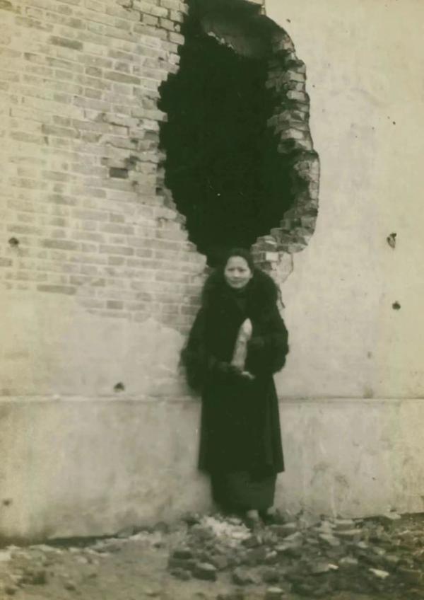 1932年,宋庆龄在抗战前线。 “一·二八”淞沪抗战爆发,驻守上海的十九路军奋起反抗。宋庆龄全力支持十九路军抗战,多次冒着生命危险到前线慰问,组织救治伤员。她在今普陀区真如前线的断壁残垣前,手持未爆炸的敌军炮弹留影,表示抗战到底的决心。
