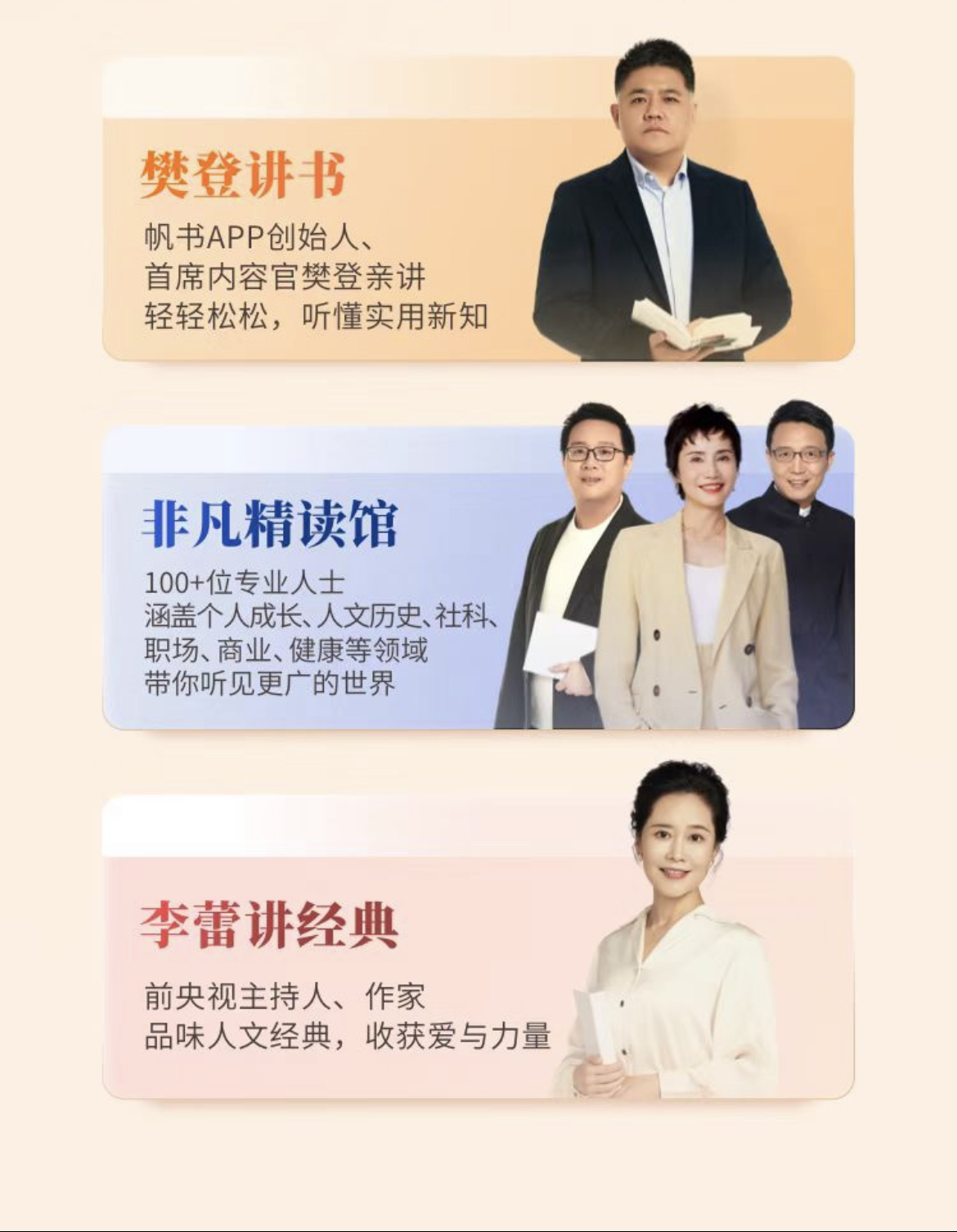 以新形象拥抱书友,“帆书”希望告诉读者:这里不是只有樊登一位讲书人,从“非凡精读馆”“李蕾讲经典”等板块的陆续布局,从教授到医生,从导演到主持人,还有作家担任知识的传播者,帆书旗下阅读推广同行者在不断增加。