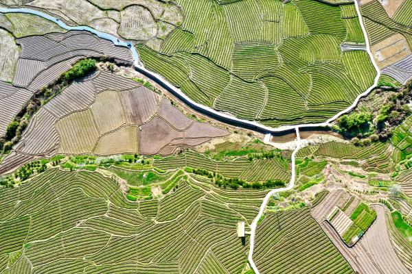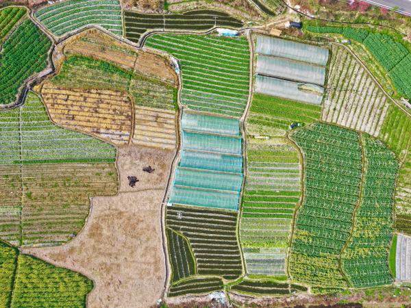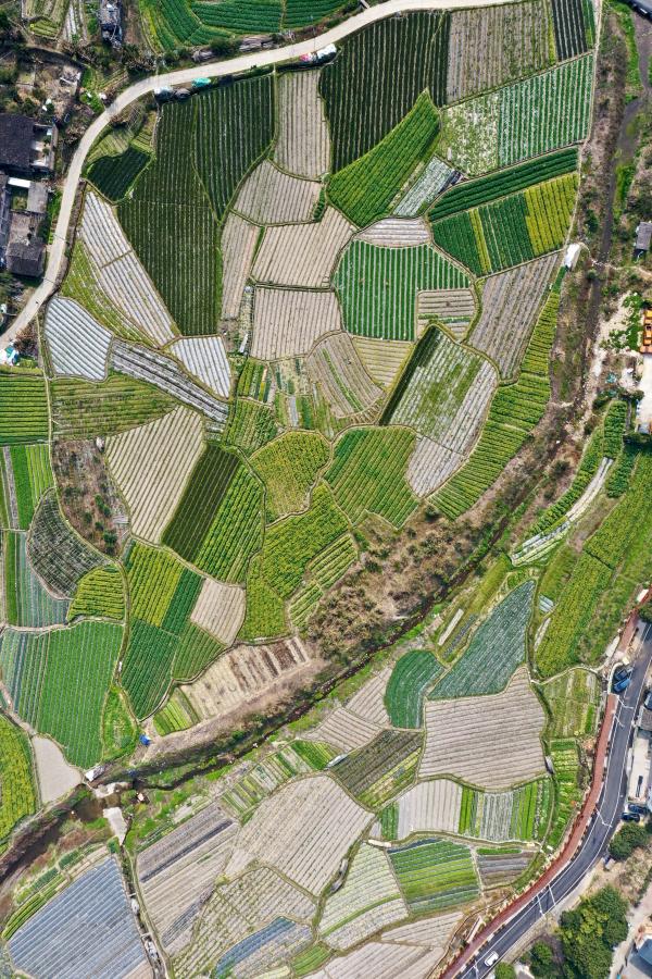 春耕时节,在福建省福州市乡村山岭间,一块块形状各异、五彩斑斓的田地犹如大地上的拼图,呈现别样的春耕画卷。