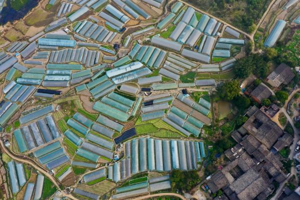 ↑2月26日拍摄的福州市闽侯县南通镇蔬菜基地景观(无人机照片)。