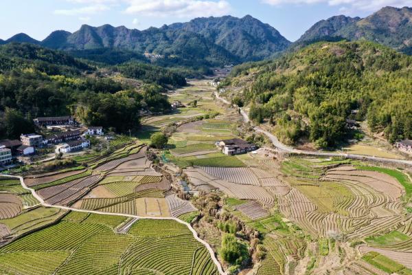 ↑2月23日拍摄的福州市永泰县白云乡白云村田野景观(无人机照片)。