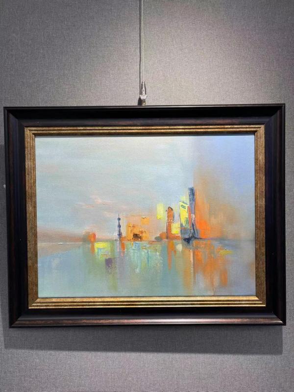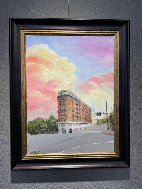 作为归国艺术家,陆原用这次画展表达了她对家乡、对友人深深的眷恋。展出的22幅作品,表述了艺术家的几个重要成长阶段。陆原在2022年创作了3幅重要作品。其中一幅是她看到的武康大楼前的灿烂天色,她记录下了这一动人时刻。最让现场观众动容的,是作品《南浦大桥》,艺术家对这幅画的简介是“致敬张介望先生和他的家人”。这位张介望先生,是南浦大桥主桥斜拉桥的设计师,却因癌症倒在了南浦大桥通车的前夕。这是艺术家少年时候亲见的故事,久久不能忘怀的她,在这次以故乡为主题的展览前夕,琢磨良久,创作了这幅大型作品。