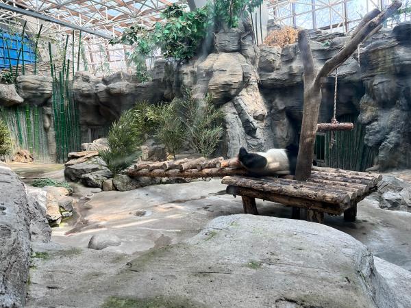 3月的北京天气转暖。上午10点半,正是大熊猫萌兰早餐后小憩的时间。或许是春风太过和煦,平日活泼好动的萌兰正四仰八叉躺在兽舍的角落打盹。这只曾拆掉监控翻出围栏和游客打招呼的大熊猫是这里的明星动物,也是传说中丫丫回国后的新邻居。