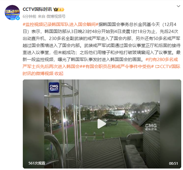 据韩国国会事务总长金民基今天(12月4日)表示,韩国国防部从3日晚23时48分开始到4日凌晨1时18分为止,先后24次出动直升机,230多名全副武装的戒严军进入了国会内部,另外还有50多名戒严军越过国会围墙进入了国会内部。武装戒严军试图通过国会议事堂正厅和后面的接待室进入议事堂,但未能成功;之后他们用锤子和步枪打破玻璃窗闯入了议事堂。最新一段监控视频,曝光了韩国军队事发时进入韩国国会的画面。